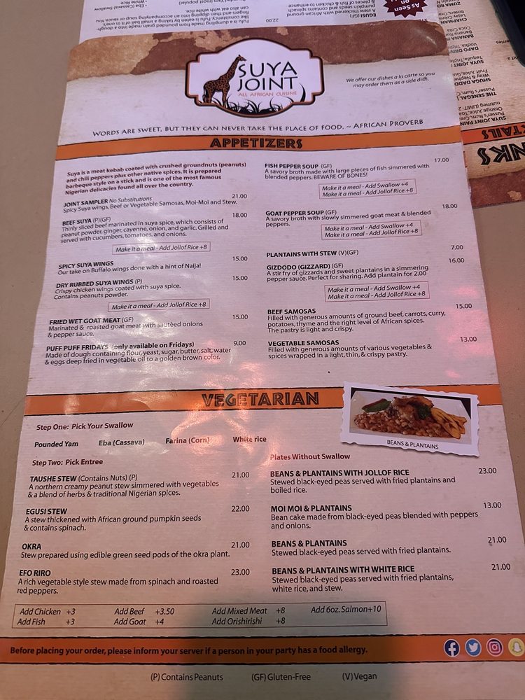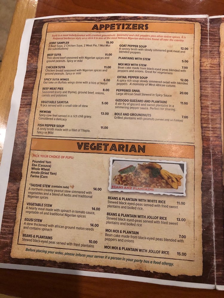 One of the highlights of Suya Joint is its extensive menu, featuring both vegetarian and vegan options. Dishes such as the Vegetarian Taushe Stew, a creamy peanut stew simmered with vegetables, and the Vegetarian Egusi Stew, made with ground pumpkin seeds and spinach, are just a few standouts. Each dish is crafted with traditional Nigerian spices that bring depth and authenticity to your meal.
